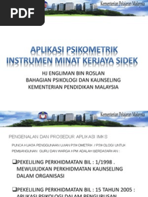Walaubagaimanapun purata masa yang digunakan untuk mengambil adalah di antara 10 sehingga 15. Psikometrik inventori minat kerjaya sidek. Psikometrik inventori minat kerjaya sidekfull description. View text version category : Inventori minat kerjaya sidek atau singkatannya imks dibina oleh sidek mohd noah dapat membantu para pelajar dalam memilih aliran pembelajaran yang sesui dengan minat kerjaya yang akan dipilihnya kelak.